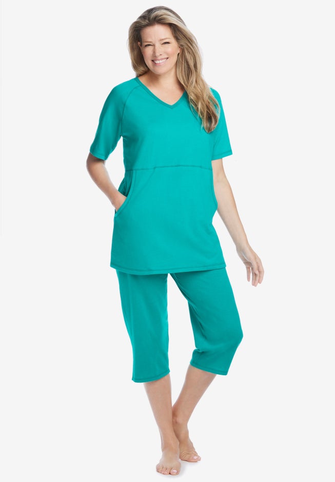 Make the most of lounging in this relaxed raglan-sleeve tee and super comfy knit capri pant sleep set. Top has kangaroo pockets and pants have full elastic waist and kangaroo pockets.