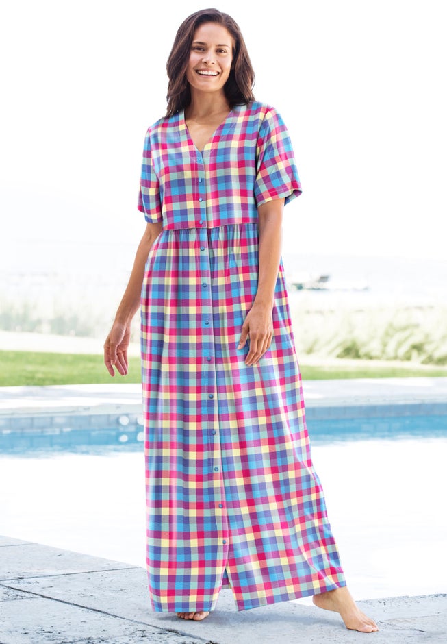 Made in lightweight seersucker fabric for warmer weather, this lounge dress looks great and keeps you cool. A snap-button front and shirred empire waist give the look of a casual dress that makes this perfect for wearing around the house.