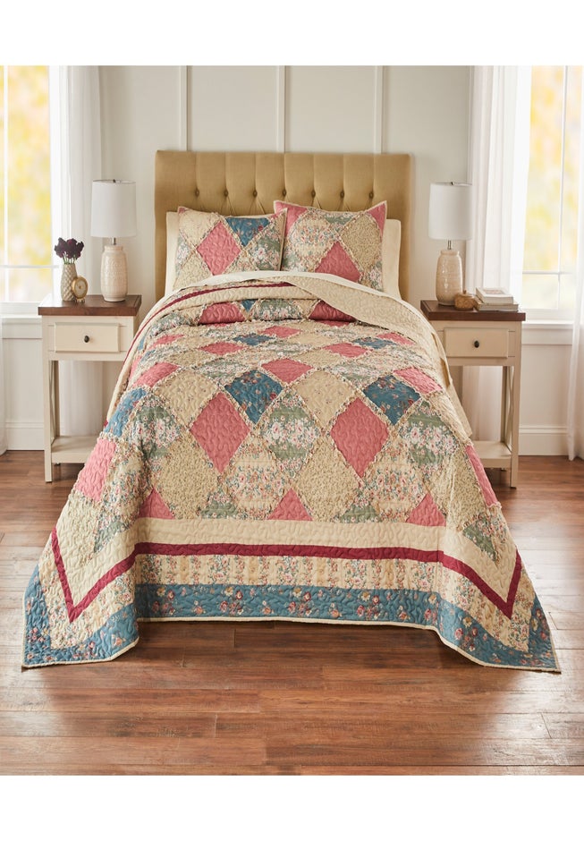 Perfect for the guest or master bedroom, this vintage-style bedding collection blends various patterns and colors including center diamond prints with 1" ruffle and a stripe print border.