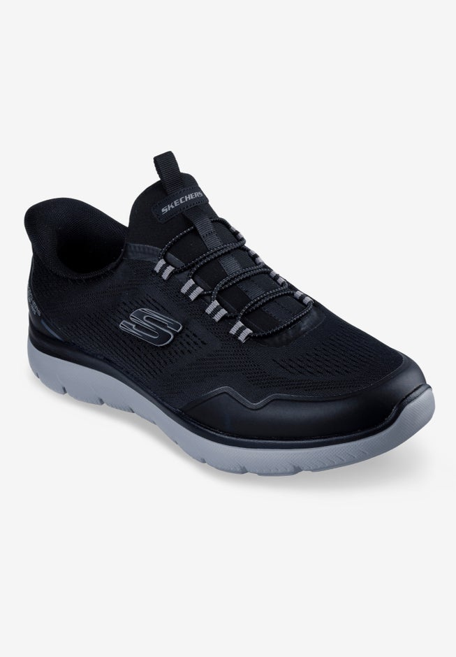 Get ready for a busy day with the Skechers® Slip-Ins®: Summits Top-Rate! These hands-free Slip-Ins® feature No Tie Fit® stretch laces for quick on-and-off convenience, so you can get your day started hassle-free. And thanks to the Air-Cooled Memory Foam® cushioned insole and supportive Heel Pillow®, your feet will experience superior comfort and support with every step. No matter your schedule, these lightweight Skechers® for big and tall men will give you the cooling cushioned comfort your feet need.