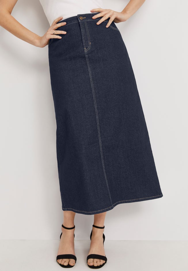 A polished denim midi skirt designed to flex comfortably while maintaining a clean, structured look, making it an easy choice for workdays, weekends and casual occasions.